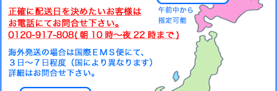 最短のお届け日についてはこちらの最短お届けマップを参考にして下さい。 尚、天候や道路状況、在庫状況やお支払方法によっては、必ずしもこのとおりにお届けできない場合がございます。 予めご了承下さい。 |